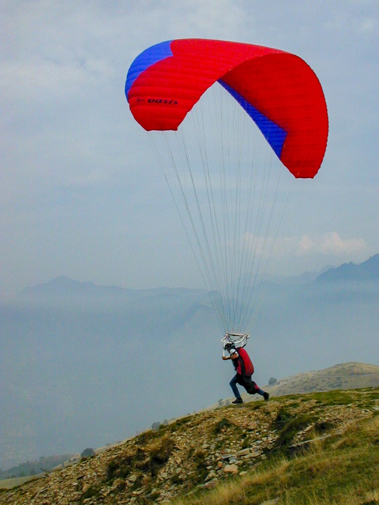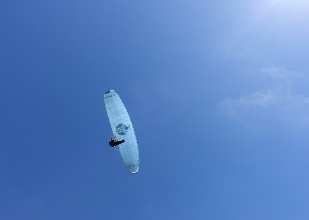 Larger collapses are countered by shifting your weight towards the wing which is still inflated and pushing the cage handle upwards on the collapsed side. If the collapse persists (as in a cravate or a massive collapse) and the wing enters a spiral, the solution is to pull big ears. Since your weight should be held towards the open side, pull the big ears handle with the hand which is on the collapsed side. Once the spiral turn is stopped and the wing is flying straight, a cravate can be pumped out with the big ears handle. It is important to understand that even though one should fly the cage with a light touch and fingertip control, in the case of a massive collapse and spiral, you should react quickly and aggressively.